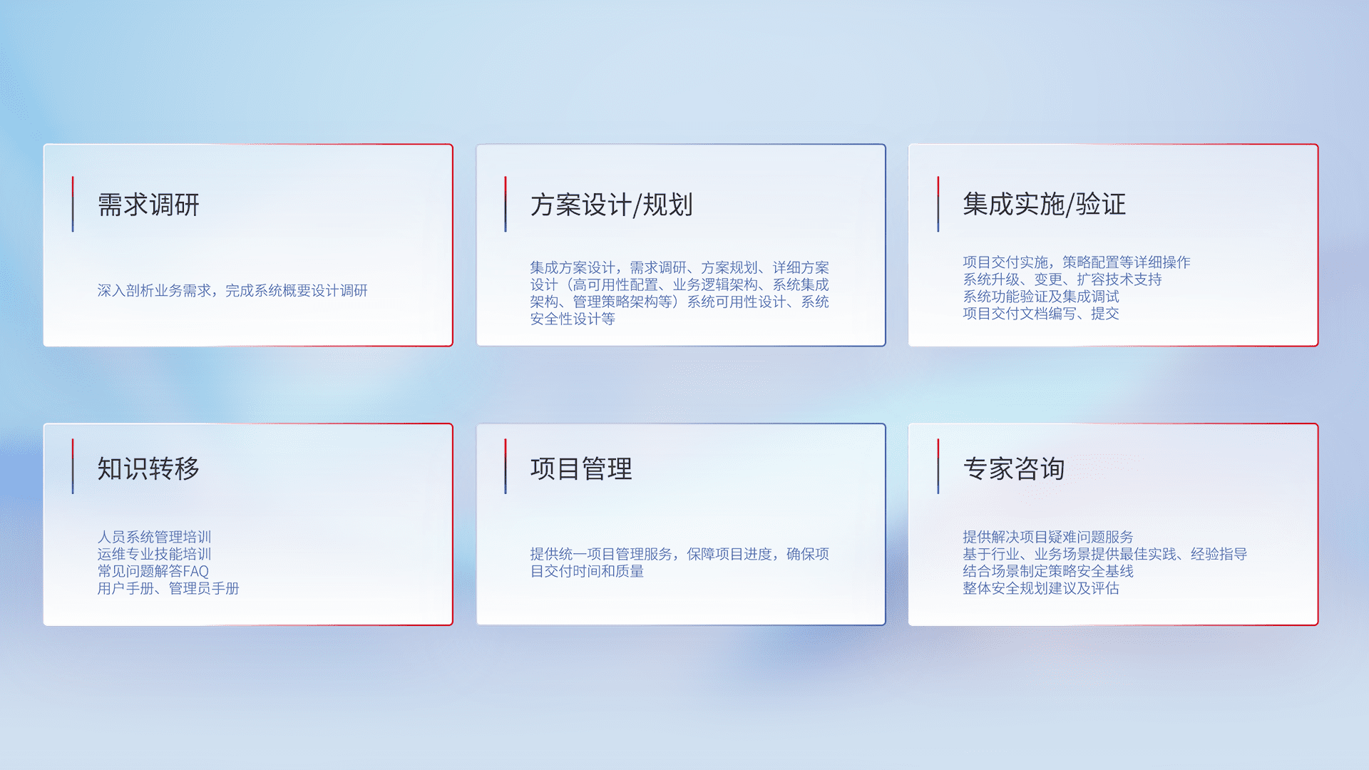 针对客户行业特性,,将宏观的安全战略和需求,,,,通过专业的交付服务,,实现项目落地,,,,为客户提供标准规范的集成交付服务。。。